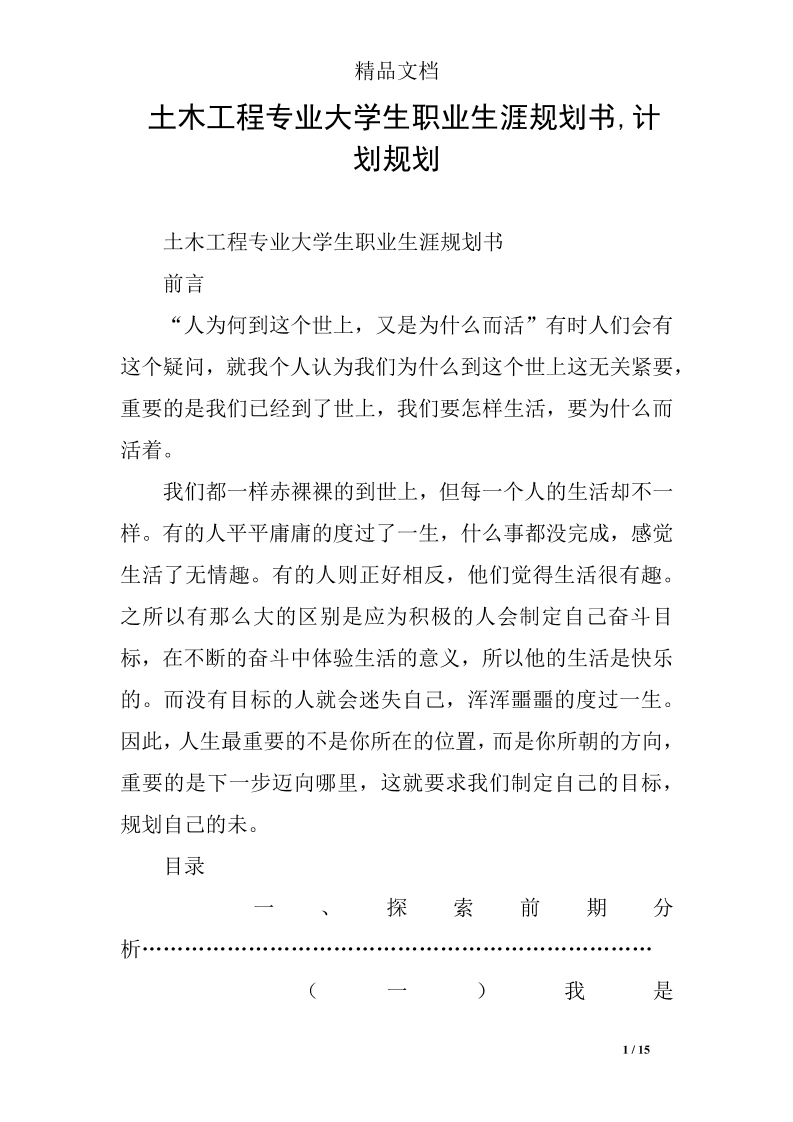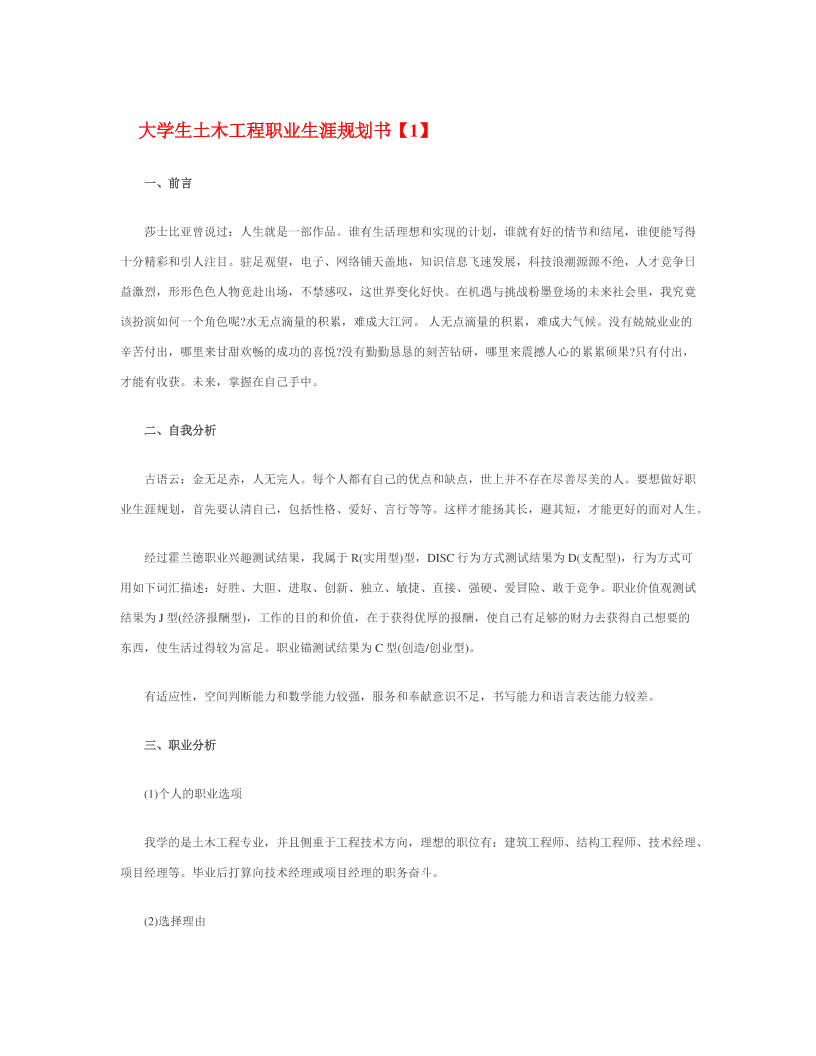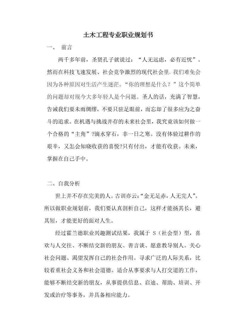 大 学 生 土 木 工 程 职 业 生 涯 规 划 书