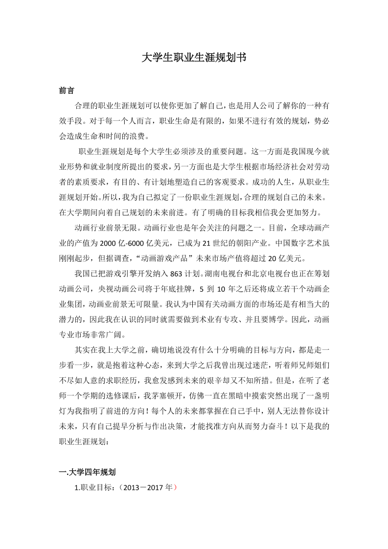 动画专业大学生职业生涯规划范文