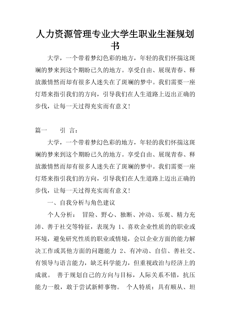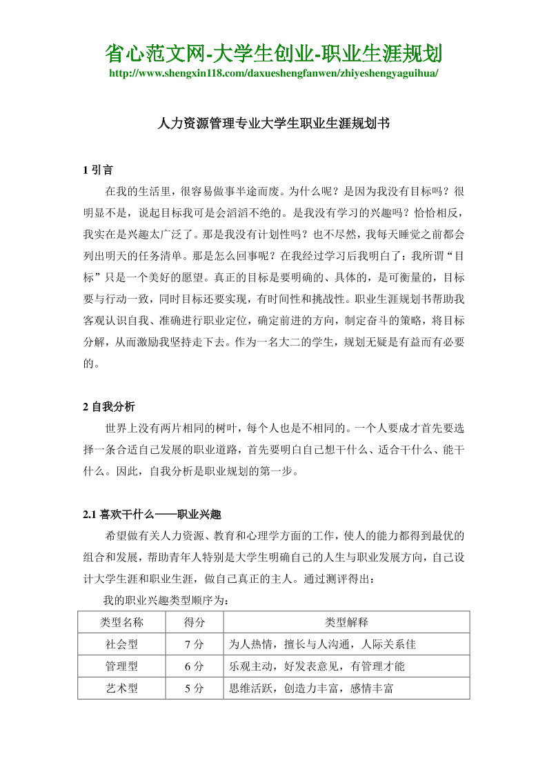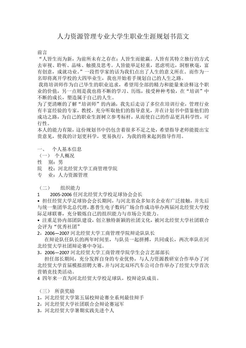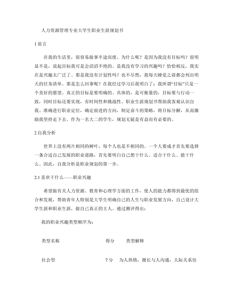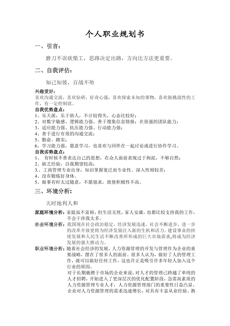 人 力 资 源 管 理 职 业 生 涯 规 划 书
