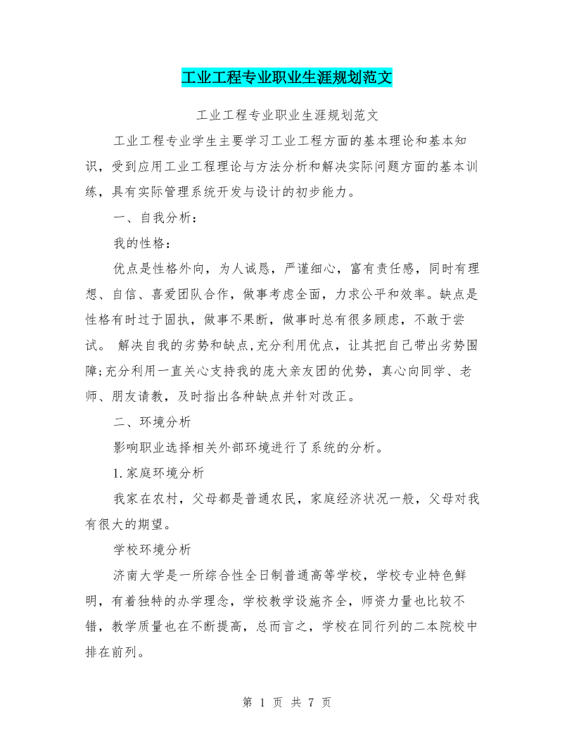 工业工程专业职业生涯规划范文