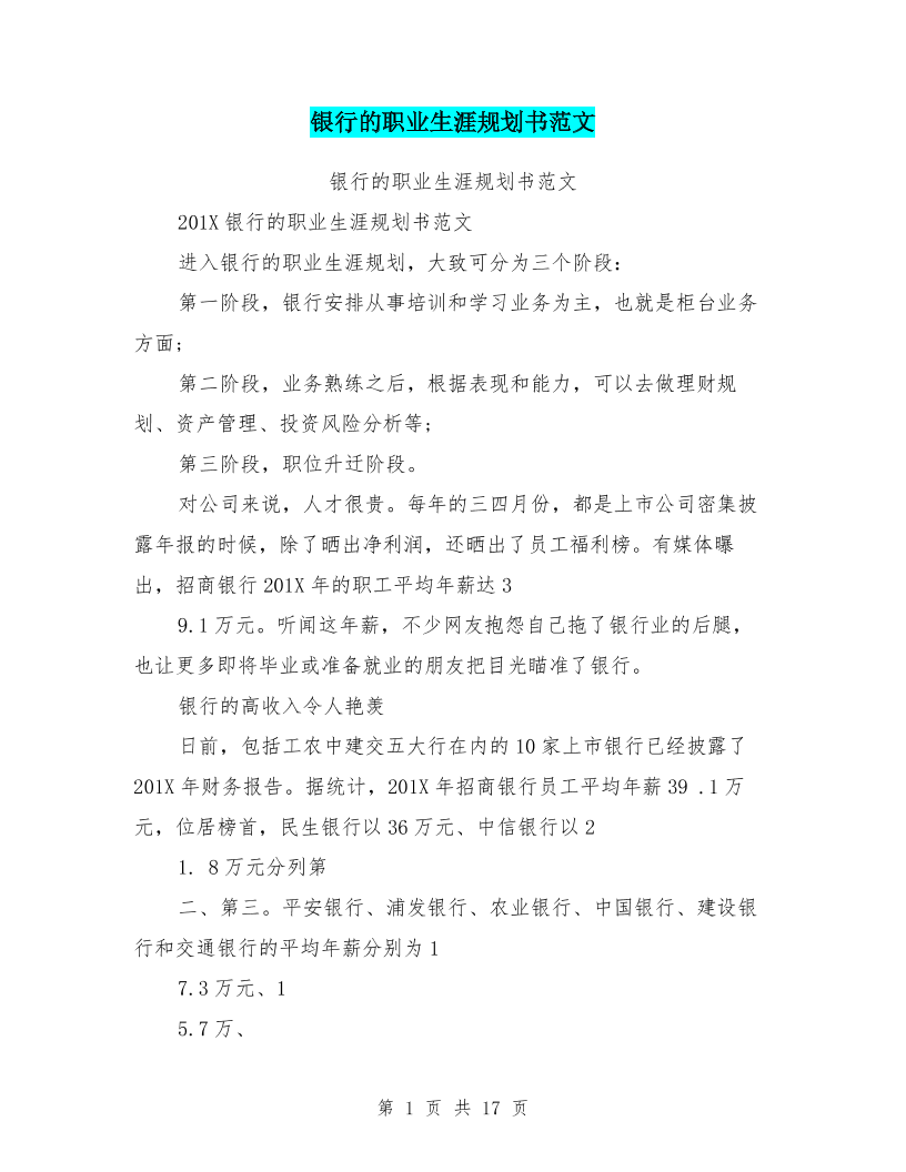 银行的职业生涯规划书范文