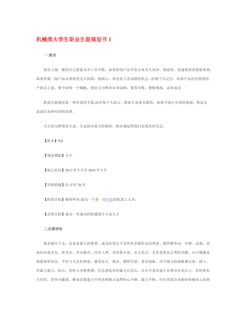 机 械 类 大 学 生 职 业 生 涯 规 划 书