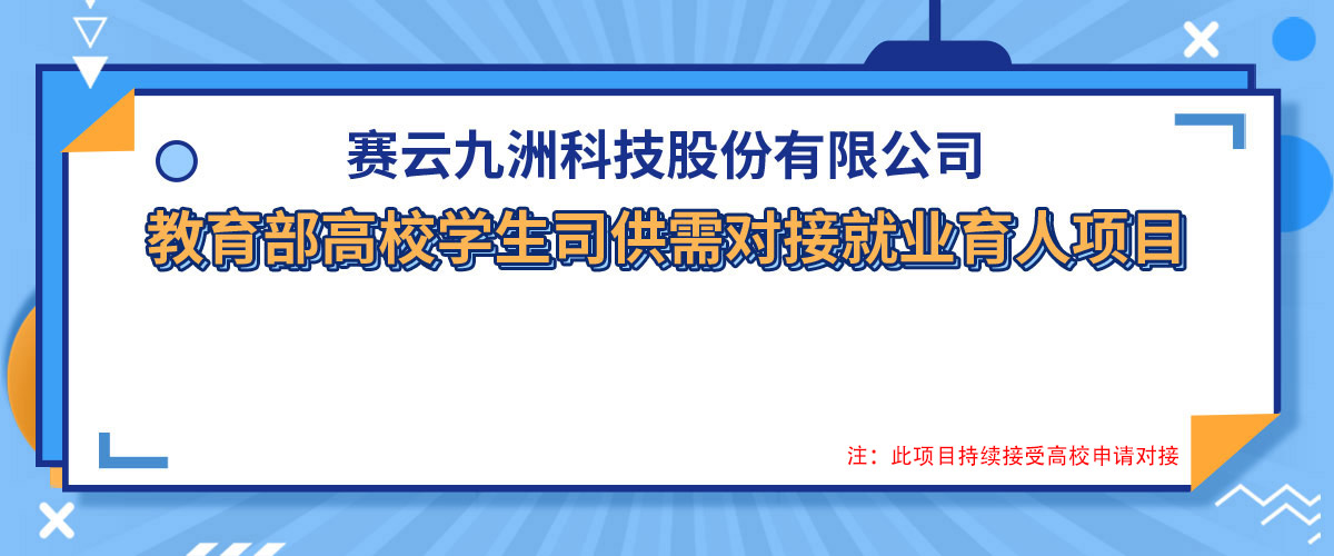 赛云九洲是一家为高校及政府提供综合解决方案的国家级高新技术企业。连续多年被评为“北京市诚信企业”,获得双软认证,北京市重点项目资金扶持。致力于携手各地政府、高校和企业,构建中国思政、创业、技能、就业“四态合一”的中国青年创新战略云服务平台。以独创的专创融合、思创融合、就创融合、赛创融合的协同育人体系,为创业、就业者提供“创新、创业、创造”三创平台,形成集“培训实训、孵化运营、赛事活动、就业对接”为一体的完整三创服务体系,树立了体系完善,服务全面,产品卓越,行业领先的品牌形象,引领我国三创服务领域发展前行。 2019、2020连续两年荣获教育部产学合作协同育人项目。专注高校及社会机构的创新创业教育、智慧党建领域。设计录制《创新创业云平台》的微课体系,研发创业类、就业类、思政类,党建类、医药类、电商培训类、志愿服务类,商务英语类软件平台30余款。 在“互联网+”时代下,通过《创业基础虚拟仿真训练平台》建设,推动中国创业教育供给侧改革的创新发展。努力改善教育供给结构,形成丰富、多元、可选择的新供给侧结构,实现教育改革从“需求侧的拉动”到“供给侧的推动”的根本转变。 赛云九洲本次供需对接就业育人项目包括:定向人才培养培训项目、就业实习基地项目、人力资源提升项目。